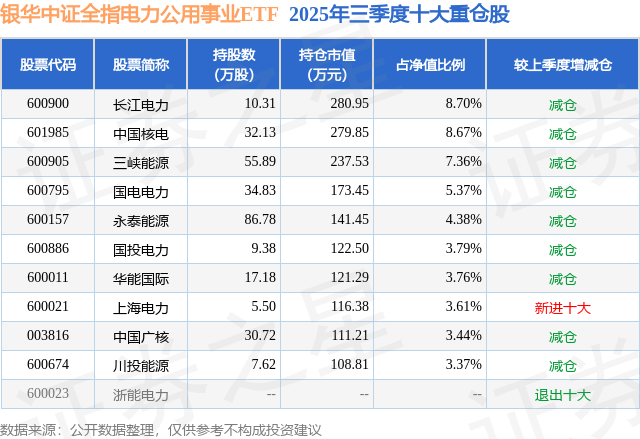 从基金规模来看,银华中证全指电力公用事业ETF基金2025年三季度公布的基金规模为0.32亿元,较上一期规模4748.32万元变化了-1520.09万元,环比变化了-32.01%。该基金最新一期资产配置为:股票占净值比98.03%,无债券类资产,现金占净值比2.03%。从基金持仓来看,该基金当季前十大股票仓位达52.45%,第一大重仓股为长江电力(600900),持仓占比为8.7%。