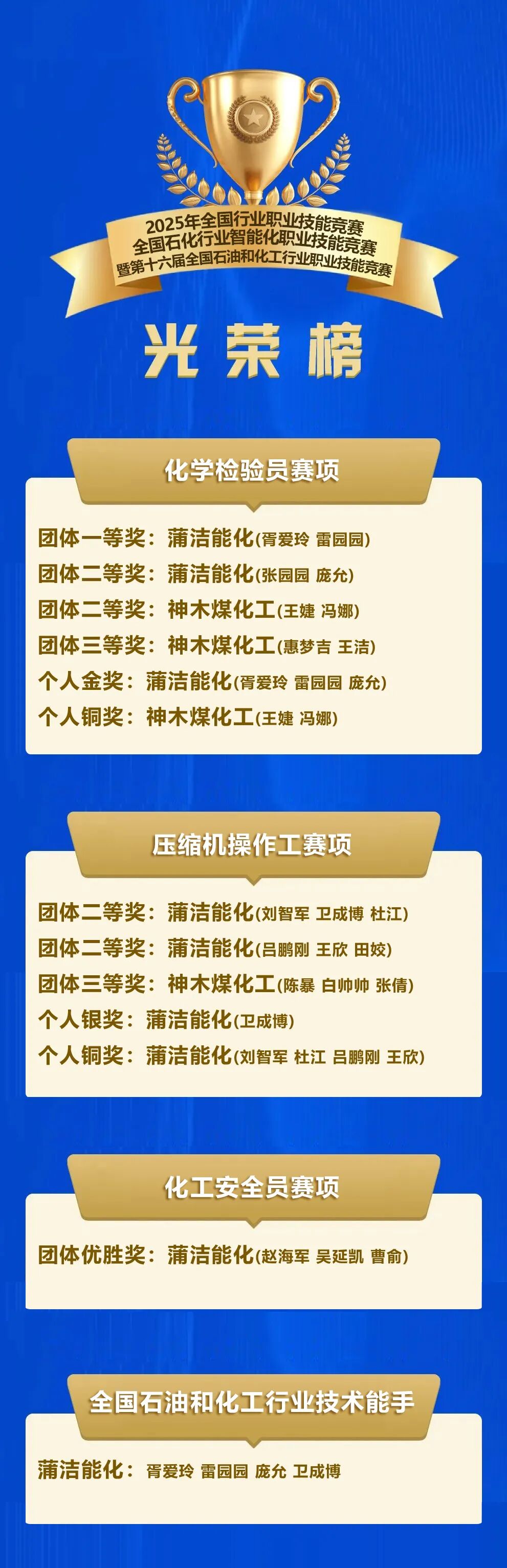 陕煤集团所属化工板块蒲洁能化、神木煤化工积极组队参赛,为参赛选手量身定制专项培训方案,通过开展封闭式集中训练,精准打磨技能。经过为期三天的激烈角逐,陕煤参赛队伍斩获团体一等奖1项、二等奖4项、三等奖2项、团体优胜奖1项;个人金奖3项、银奖1项、铜奖6项;4人获评“全国石油和化工行业技术能手”。